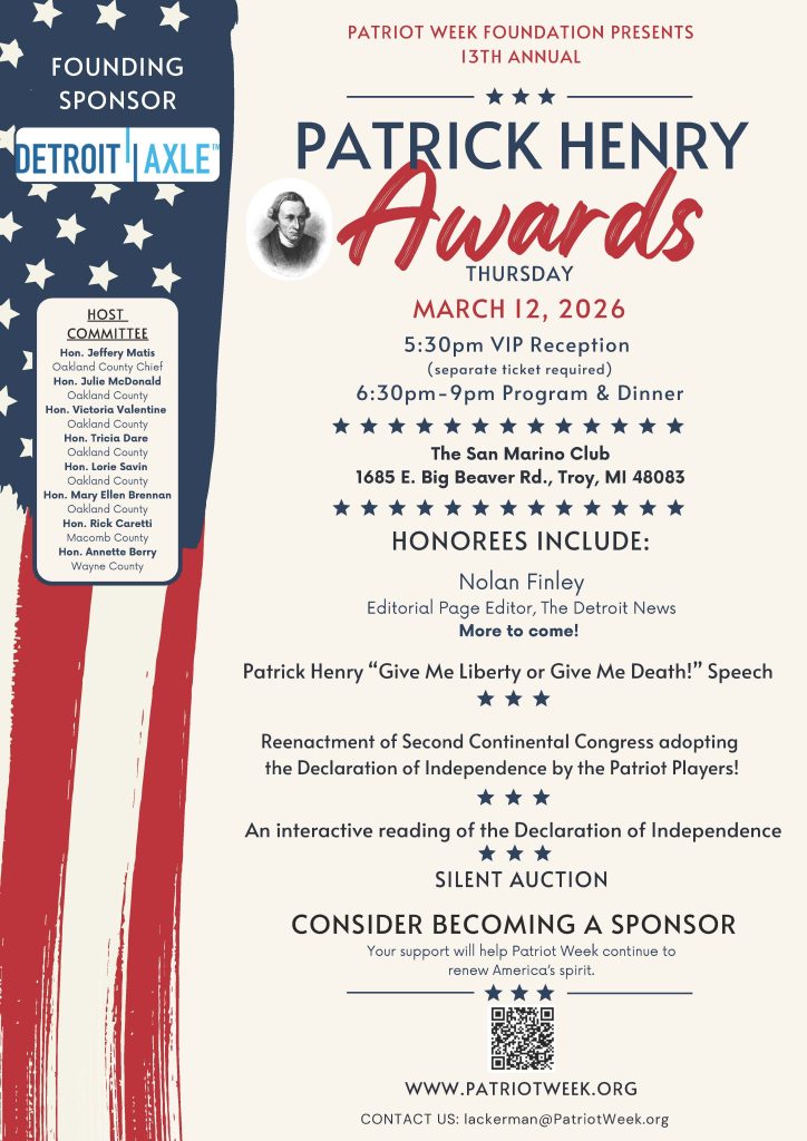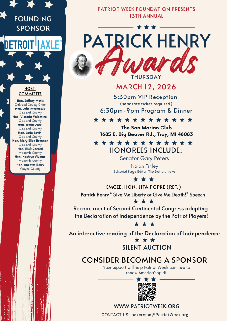 Patriot Week renews America’s spirit by deepening the appreciation of the First Principles, Founding Fathers and other Patriots, vital documents and speeches, and flags that make America the greatest nation in world history.